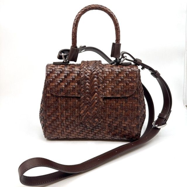 kleine crossbody in bruin gevlochten leder.
