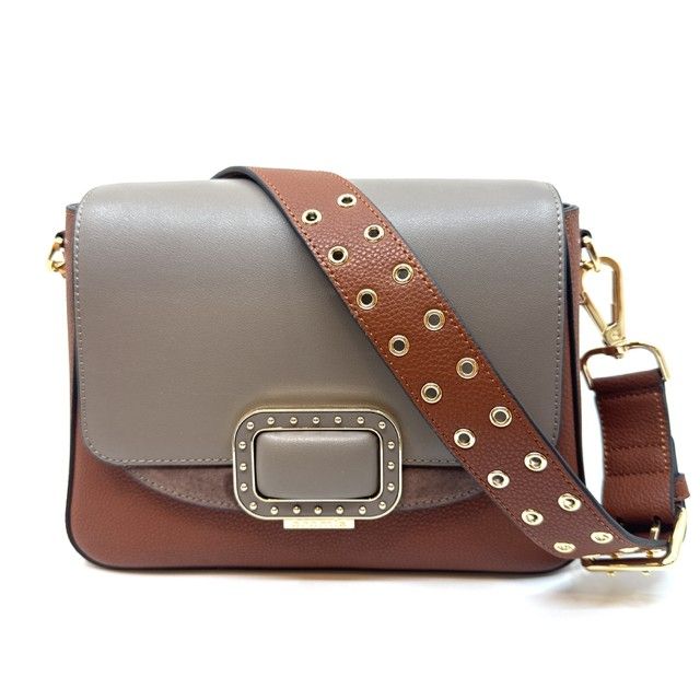 schoudertas in cognac en taupe leder, inclusief lange riem.