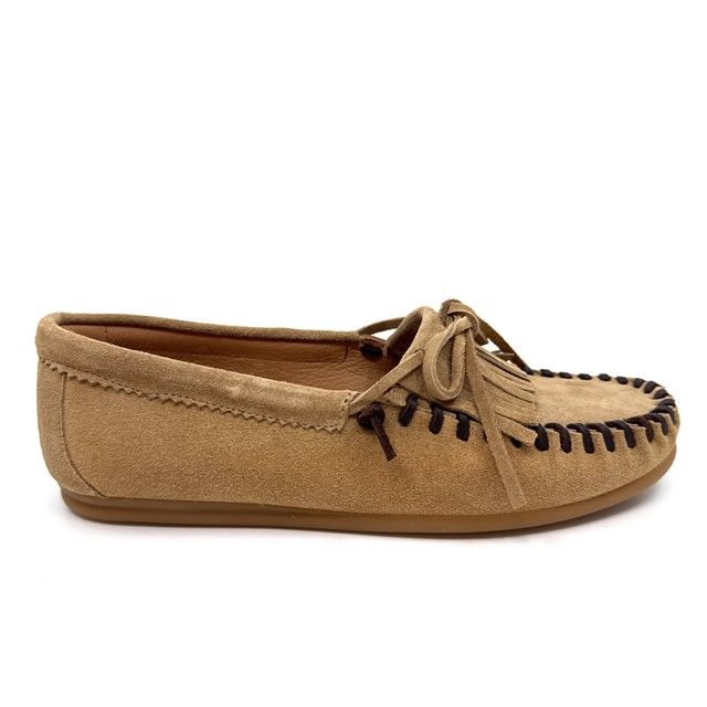 mocassin in cognac daim met bruine stikking en antislipzool.