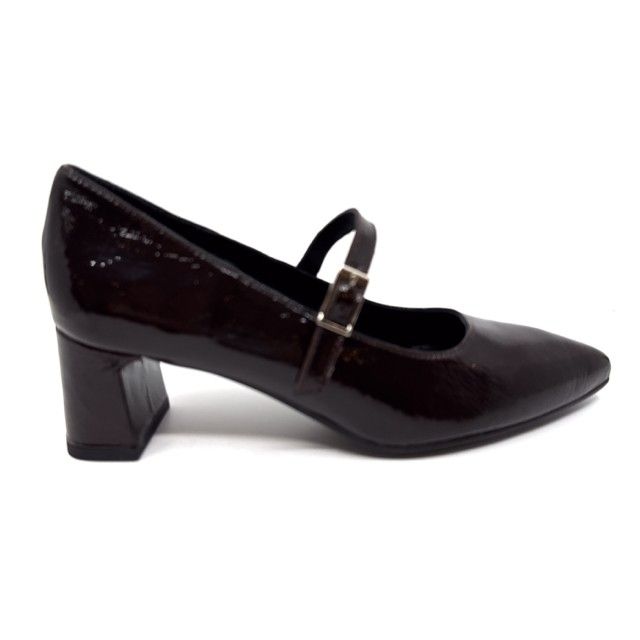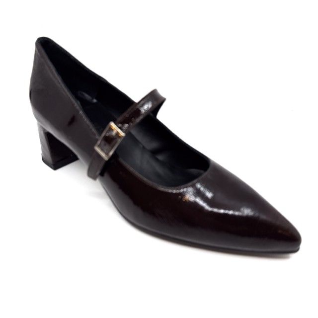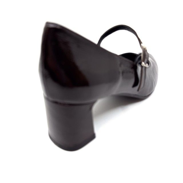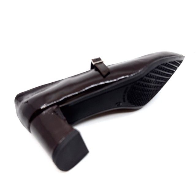 pump bruin lak met riempje en antislipzool.