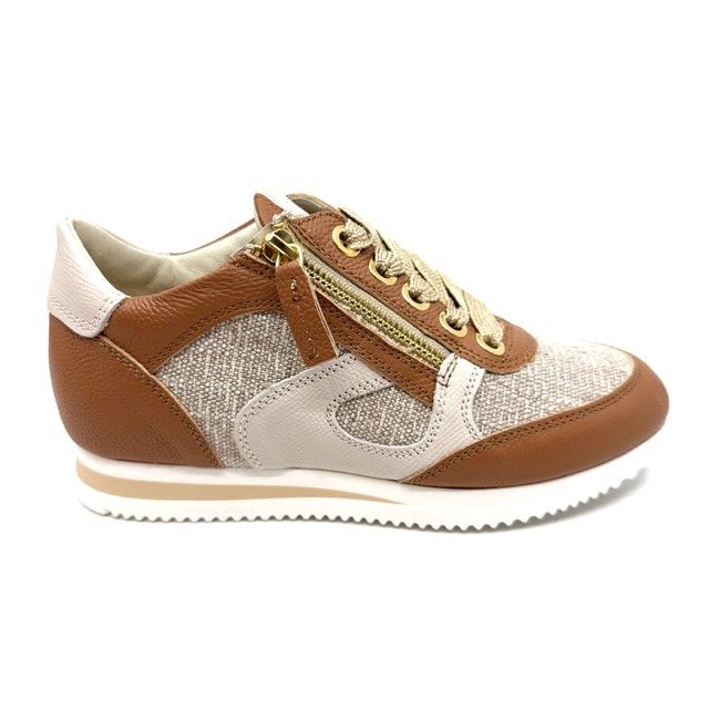 sneaker in cognac leder met tweed, uitneembaar voetbed.
