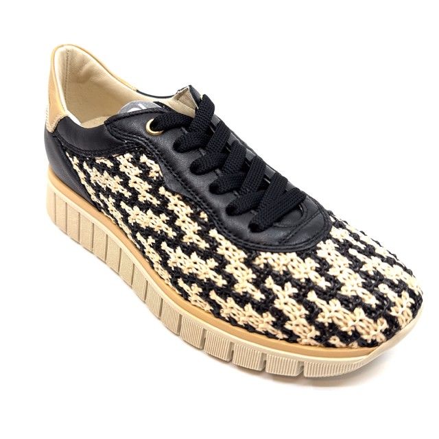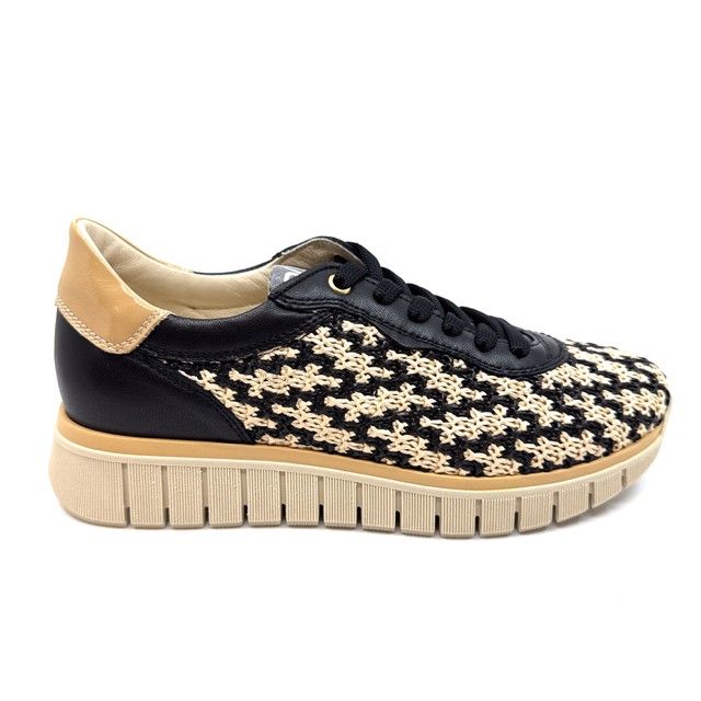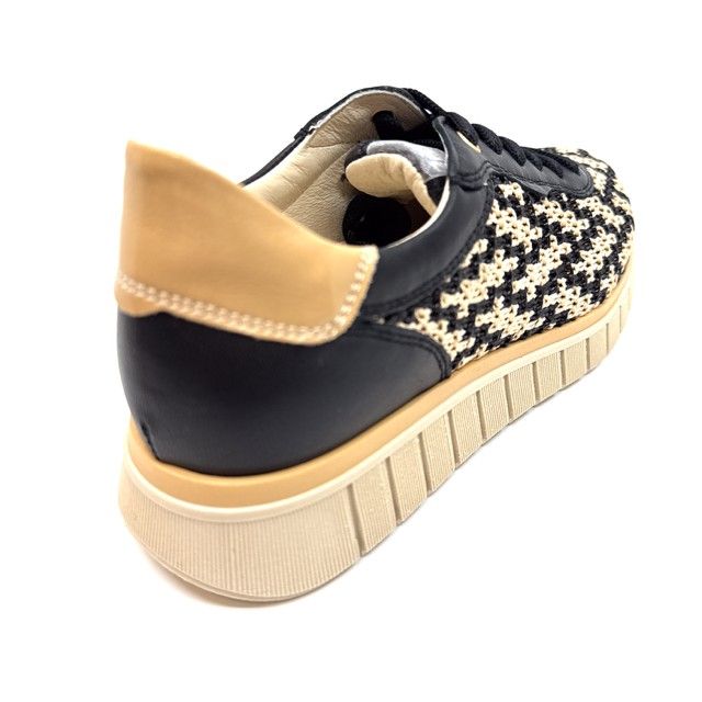 sneaker in zwart leder, gecombineerd met zwart/beige stof, uitneembaar voetbed.