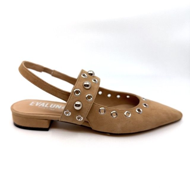 ballerina in beige daim met studs en open hiel.