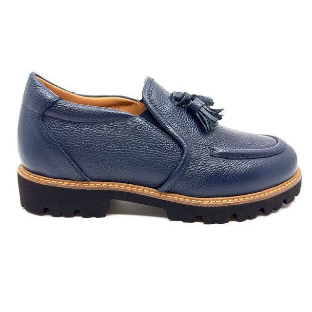 mocassin in blauw leder met kwast en uitneembaar voetbed, geschikt voor steunzolen.