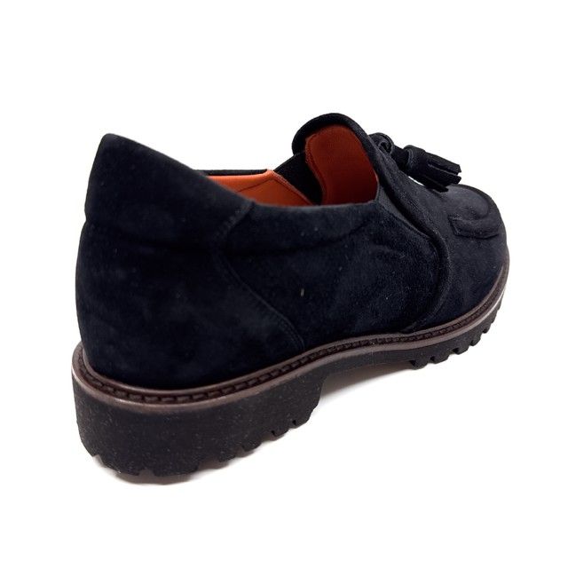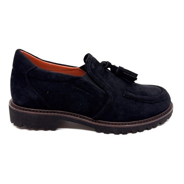 mocassin in zwarte daim met uitneembaar voetbed, geschikt voor steunzolen.