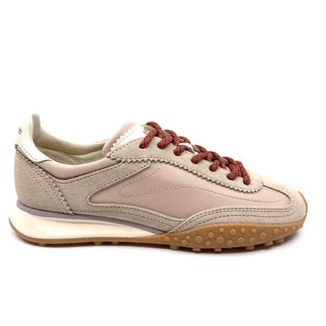 sneaker in beige tinten met rode veter en uitneembaar voetbed.