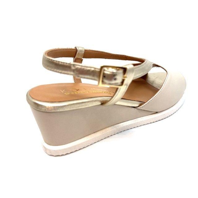 sandaal in off-white leder met accent in goud, sleehak en antislipzool.
