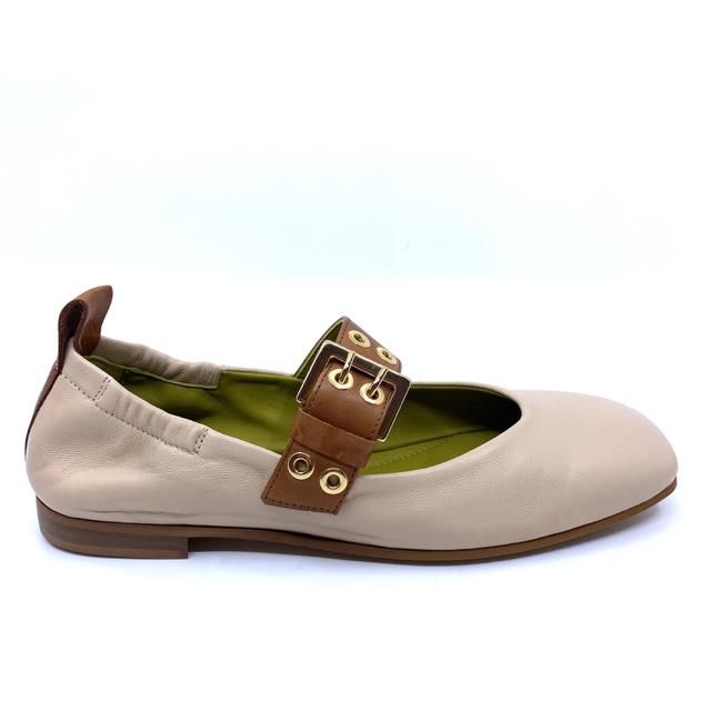 ballerina in off-white leder met gesp in cognac.