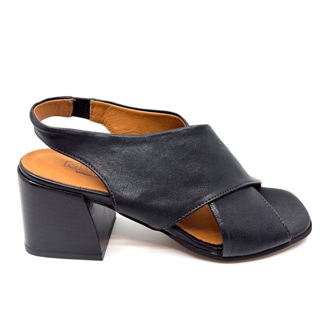 sandaal in zwart leder met middelhoge hak en leder zool.
