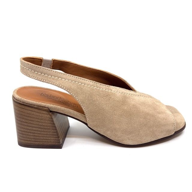 sandaal in beige daim met middelhoge hak en leder zool.