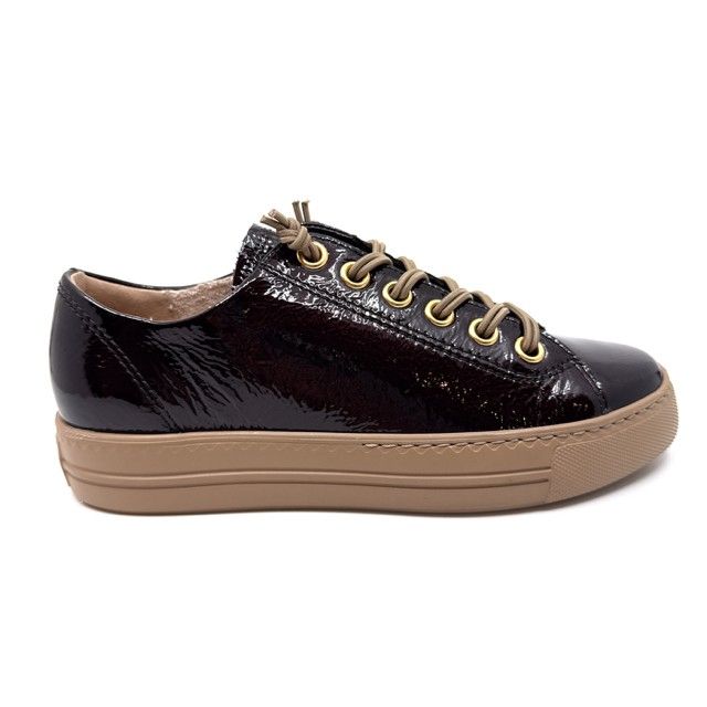 sneaker in bruin lakleer met uitneembaar voetbed.
