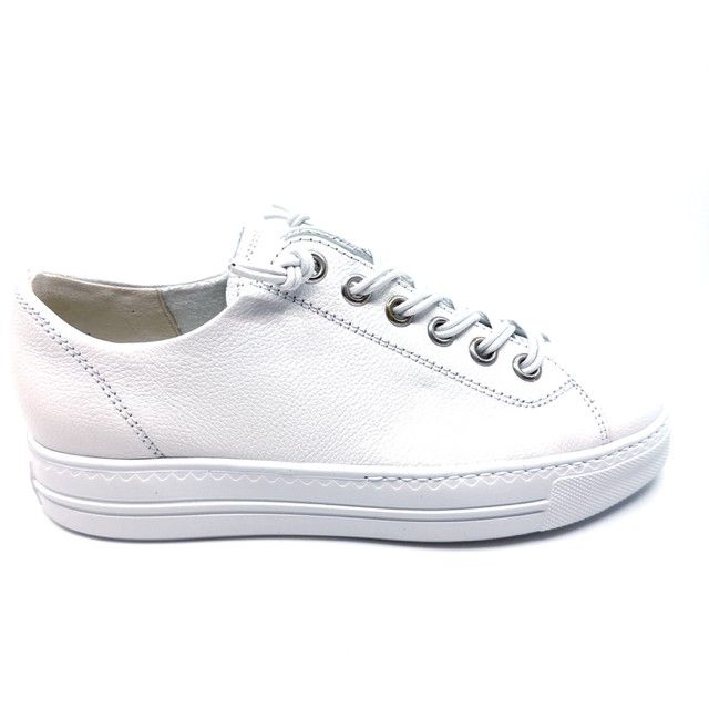 sneaker in wit leder met elastiche veters en uitneembaar voetbed.