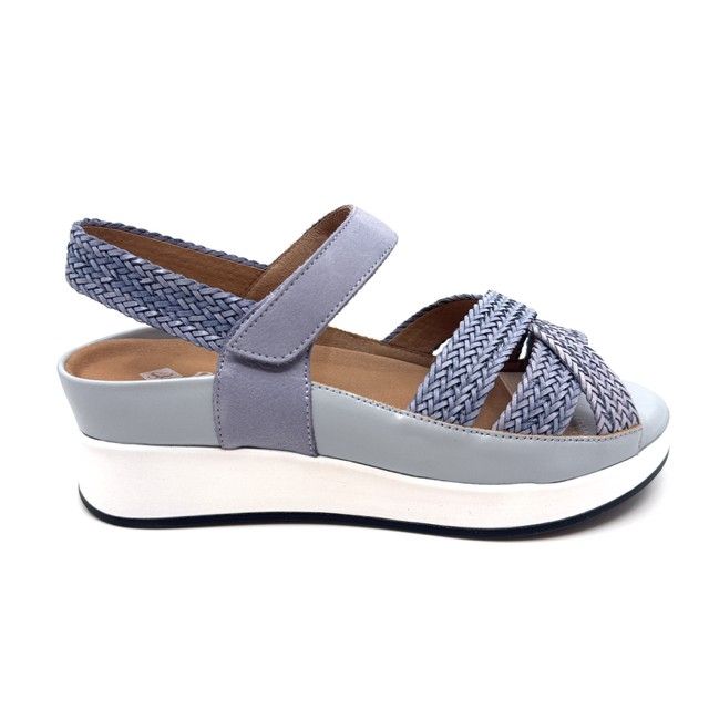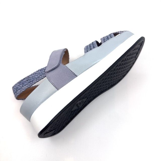 sandaal in lichtblauw gevlochten leder met uitneembaar voetbed, geschikt voor steunzolen.