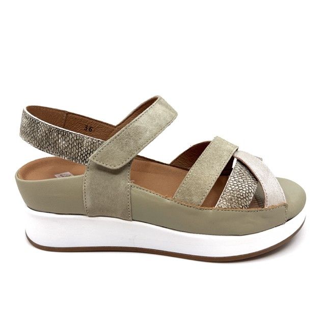 sandaal in kaki daim met uitneembaar voetbed, geschikt voor steunzolen.